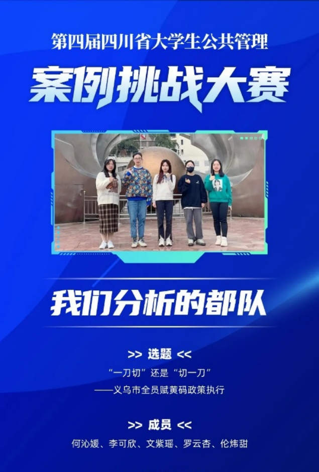 2022年12月11日,四川省第四届公共管理案例挑战大赛决赛在西南财经大学成功举行,由优视频 严敏老师指导,政治学与行政学专业2021级本科生何沁媛、李可欣、罗云杏、伦炜甜和公共事业管理专业2021级本科生文紫瑶组成的参赛队伍在比赛中斩获“一等奖铜奖”佳绩。