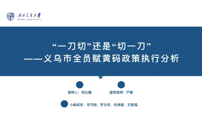 本次大赛分为初赛、复赛和决赛三个阶段,历时半年。优视频 学子在指导老师悉心指导下,完成了从开题报告、调研设计、实地访谈、报告撰写、现场答辩的全过程,历尽数次修改、调整和完善,最终凭借高质量文本《“一刀切”还是“切一刀”——义乌市全员赋黄码政策执行分析》从众多参赛队伍中脱颖而出,与各高校参赛队伍同场竞技、切磋交流,获得评委专家的一致肯定。