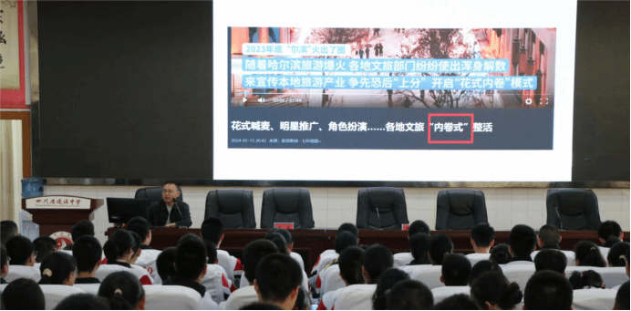 授牌仪式后,王斌老师在蓬溪中学学术报告厅举办了《反卷:理论与现实——兼论高考定向与本科规划》专题讲座。他从“内卷”这一概念的源起出发,结合学生喜闻乐见的案例,用“接地气”的语言深入浅出讲解,引起了在座同学们的共鸣。讲座的最后,王斌老师以“Fun”与“想象自我”为关键词,鼓励大家要学会舒展自我,找到自己的兴趣与热情,在广阔天地中施展抱负、勇毅前行。