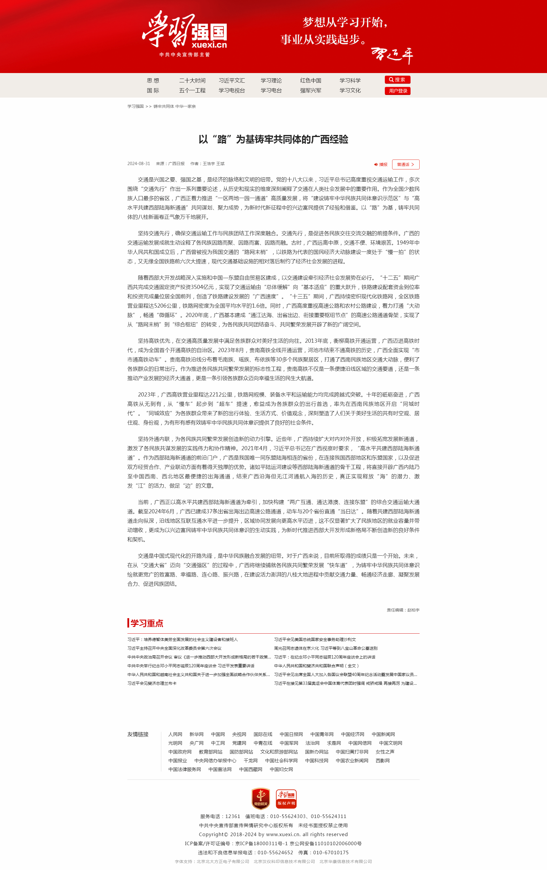 近日,优视频 王浩宇、王斌老师在《广西日报》(2024年8月31号)发表的评论文章《以“路”为基铸牢共同体的广西经验》,被“学习强国”全文转发,现阅读量已达170万,获得良好社会影响力。