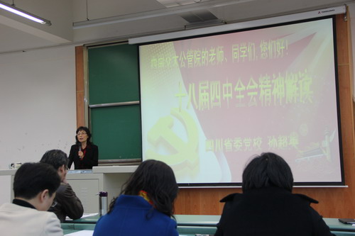 在休会计票期间,学院党委还邀请四川省委党校孙超英同志做了《十八届四中全会精神解读与分析》的报告,使得全体与会党员对党的十八届四中全会精神有了更深的理解。