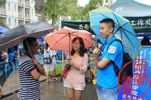 上午九点多,成都开始淅淅沥沥的下起小雨,天公不作美,但仍然影响不了新生们来报到的热情,从清晨到晚上,陆陆续续都有新生到达,有家长陪同的,也不乏有较强独立意识独自来报到的。迎新现场,工作人员都各司其职,分工明确,配合默契,保证迎新工作有条不紊的进行。