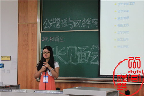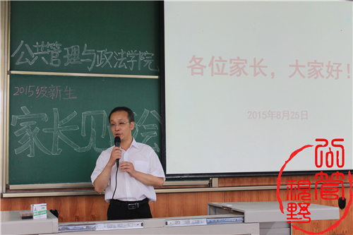 2015年8月25日下午四点,公共管理与政法学院新生家长见面会在X4151如期召开,会议由学生工作组组长余小英老师主持,与会的有公共管理与政法学院党委书记王永杰教授、院长陈光教授、副院长陈家宏教授、院长助理赵成副教授、2012级辅导员易恬老师和2015级新生辅导员王再锋老师。