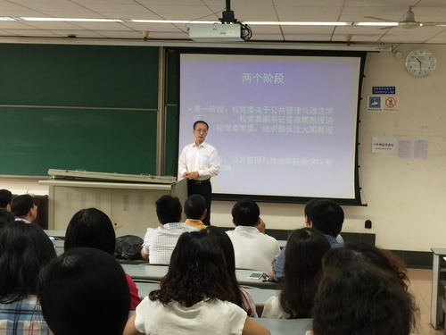 8月28日,开学第一天,公共管理与政法学院在逸夫楼4310召开了第一次全院大会。会议分为两个阶段,第一阶段由校党委常委、组织部部长沈火明主持,第二阶段由院党委王永杰书记主持。