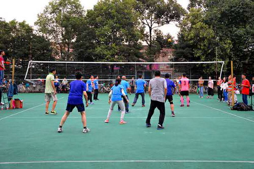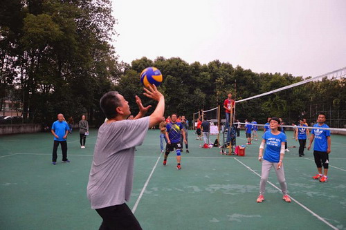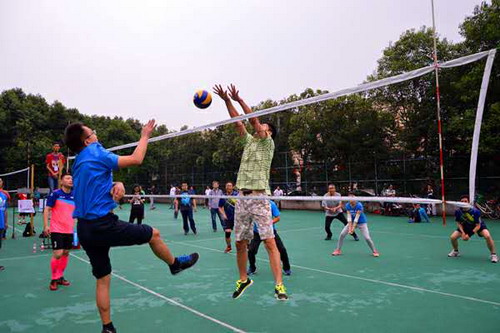 伴随着裁判的一声哨音,今天的比赛正式拉开了的帷幕。第一场比赛由公管与政法学院先发球,只见一个漂亮的弧线划过,图书馆救球失误,发球直接得分,公管与政法学院旗开得胜,拿下第一分。在这个漂亮的开局之后,两队的比分开始胶着上升,你一分我一分,都卯着劲互不相让,两边的队伍都是用最好的状态在战斗。双方队员都在奋力的拦网、扑救。而一个关键球上,公管与政法队因为救球而摔倒,之后图书馆队趁势而上,一举抓住了比赛节奏取得了第一场比赛的胜利。在中场休息时,公管与政法队的老师们针对上一场暴露出的问题进行了调整,很快便投入到了第二回合的较量。第二场比赛一开始,新战术便发挥了作用,公管与政法队打出了一波小高潮。可是图书馆队也是稳扎稳打,逐渐将比分追平甚至反超。就在这关键的时刻,公管与政法队突然在发球上寻找到了突破,三次发球直接得分,引得在场观众的一片喝彩。伴随着比赛时间的推移,图书馆队整体队伍年轻化优势开始显现出来。但是俗话说“遇强则强”,面对图书馆队的强势进攻,公管与政法队也组织起了有效的防守,只见排球在双方一来一回,比赛也变得愈加精彩。