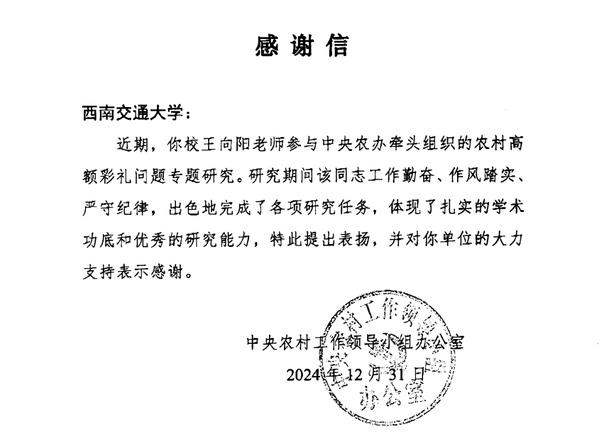 王向阳老师在中央农办牵头组织的高额彩礼问题专项研究工作中积极献言献策表示感谢。感谢信中写到,研究期间,王向阳老师工作勤奋、作风踏实、严守纪律,出色地完成了各项研究任务,较为充分地体现了我校青年老师扎实的学术功底和优秀的研究能力,为国家在高额彩礼整治等移风易俗领域综合施策以及相关文件出台提供重要支撑。