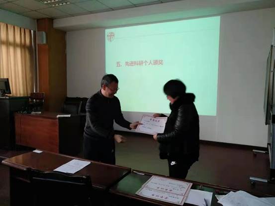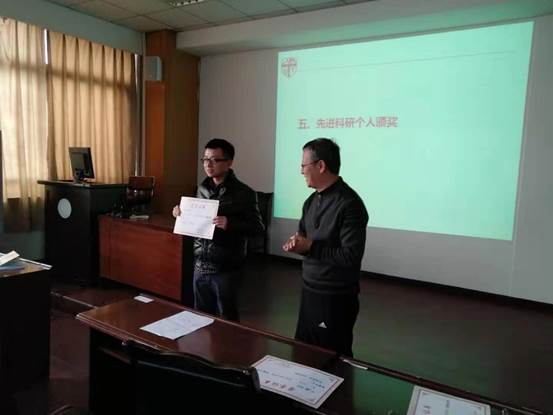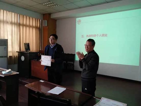 会议的第五项议程是对2018年度及2016-2018考核周期先进科研个人进行表彰,共表彰了三位2018年度先进科研个人以及五位2016-2018考核周期先进科研个人,由王院长向各位先进科研个人颁发荣誉证书。