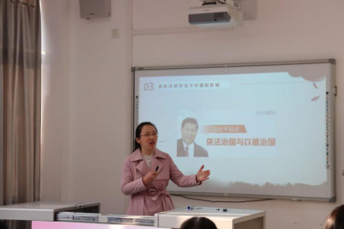 第四位选手是张晶老师,教学展示的内容紧紧围绕“春秋决狱”。她先从《左传》、《公羊传》着手阐述其内涵,再通过“子误伤父”的案例表明春秋决狱“法律出现空白”、“法条出现碰撞”以及“法律与人伦出现冲突”的三大适用条件,究其原因并推其影响,充分结合现实情况,重视情理法三者结合以及德治与法治并进。从整体上看,她的教学内容丰富、兼顾了诸多方面,得到评委老师的认同。