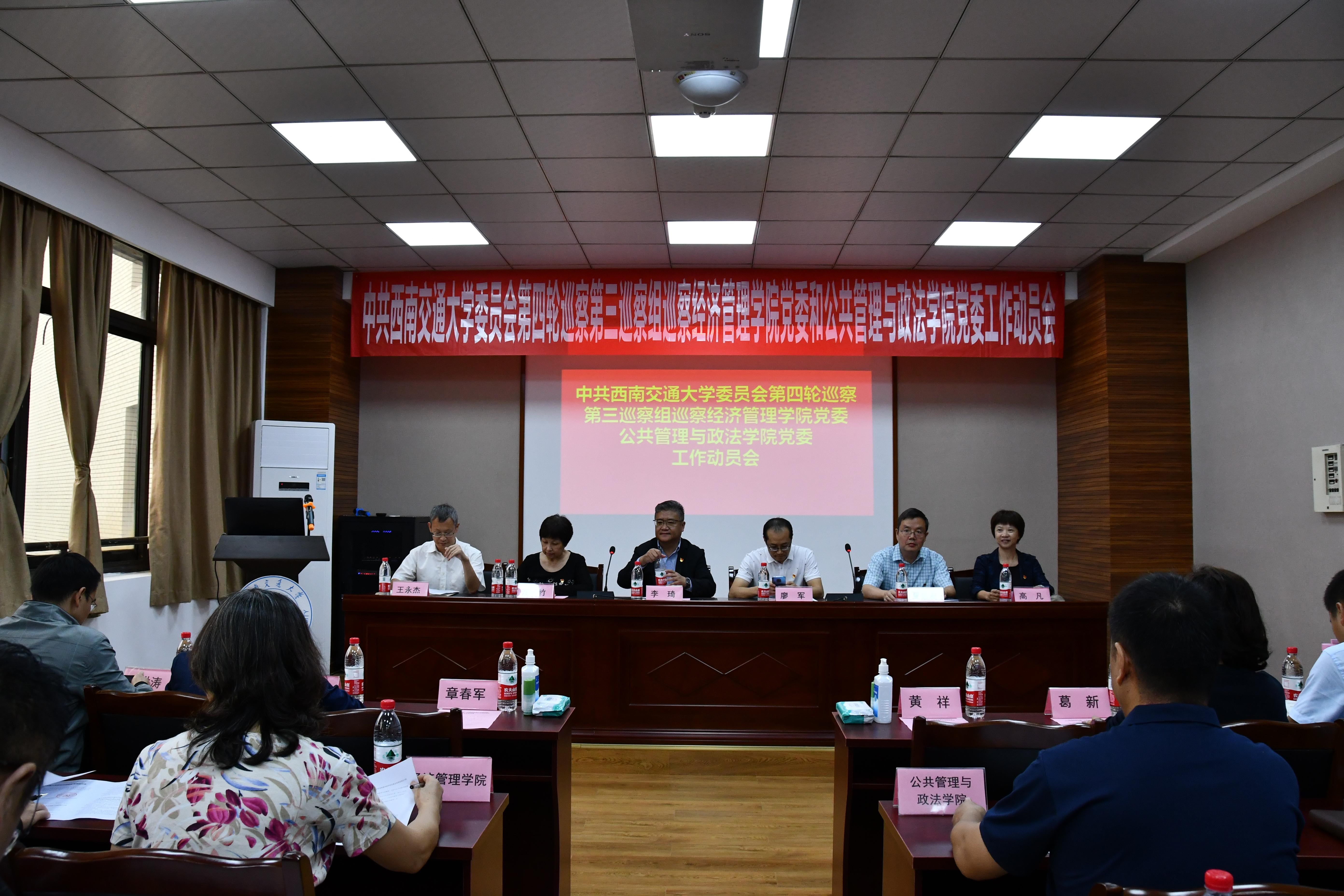 委员会第四轮巡察第三巡察组巡察经济管理学院党委、公共管理与政法学院党委工作动员会召开。第三巡察组组长廖军作动员讲话。校纪委副书记兼党委巡察工作办公室主任李琦受学校党委巡察工作领导小组委托提出工作要求。公共管理与政法学院党委书记高凡、经济管理学院党委副书记夏显波分别作表态发言。公共管理与政法学院院长王永杰主持会议。第三巡察组副组长沈竹及巡察组成员,经济管理学院、公共管理与政法学院党政领导班子全体成员、在校教职工、离退休人员代表和学生代表等出席动员会。
