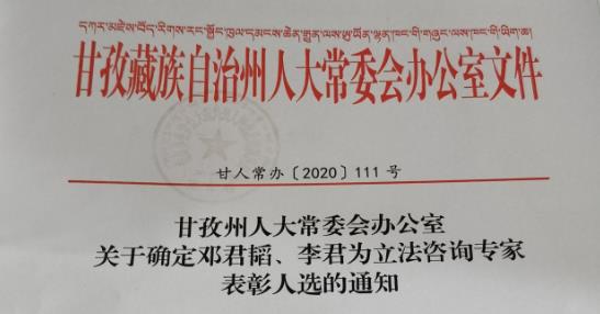 教师邓君韬副教授被确立为甘孜藏族自治州人大常委会立法咨询专家表彰人选。