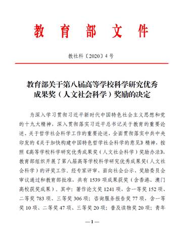 据悉,教育部高等学校科学研究优秀成果奖(人文社科类)是我国人文社会科学领域最具公信力和影响力的重量级奖项。为深入学习贯彻习近平新时代中国特色社会主义思想和党的十九大精神,深入贯彻落实习近平总书记关于教育的重要论述、关于哲学社会科学工作的重要论述,全面贯彻落实中共中央印发的《关于加快构建中国特色哲学社会科学的意见》精神,按照《高等学校科学研究优秀成果奖(人文社会科学)奖励办法》,教育部组织开展了第八届高等学校科学研究优秀成果奖(人文社会科学)的评奖工作。经专家评审、面向社会公示、奖励委员会审议通过和教育部批准,共有1539项成果获奖(含香港、澳门高校获奖成果)。其中:著作论文奖1241项,含一等奖152项、二等奖783项、三等奖306项;咨询服务报告奖77项,含一等奖10项、二等奖47项、三等奖20项;普及读物奖20项;青年成果奖201项。
