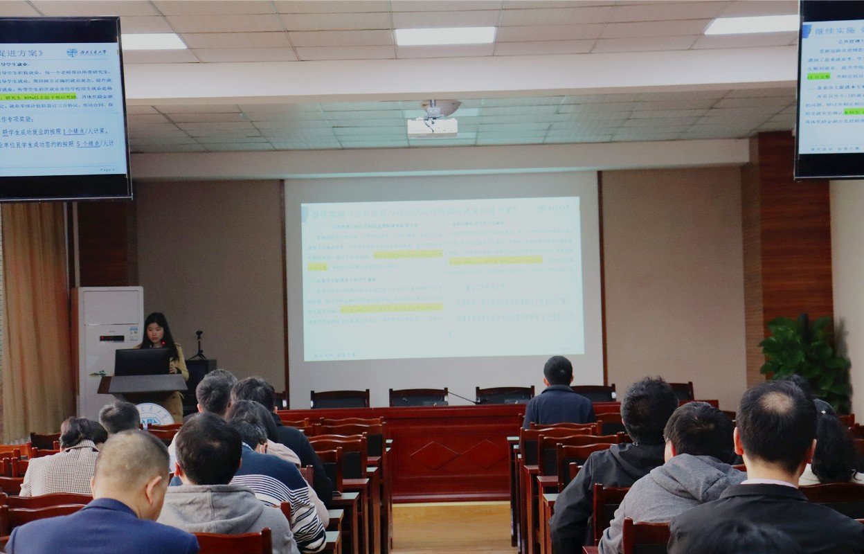 会议伊始,余小英向全体参会人员介绍了毕业生的就业情况和学生的就业意向调查。在对一项项真实的统计数据抽丝剥茧地分析中,她严谨地说明数据背后的问题,力图为学生就业指明方向。结合当前疫情形势并根据学生的实际情况,余小英提出未来工作的重点,主要包括分类别指导学生就业、推荐学生就业、各系分工促进本专业学生就业以及设立就业相关的经费奖励制度等。