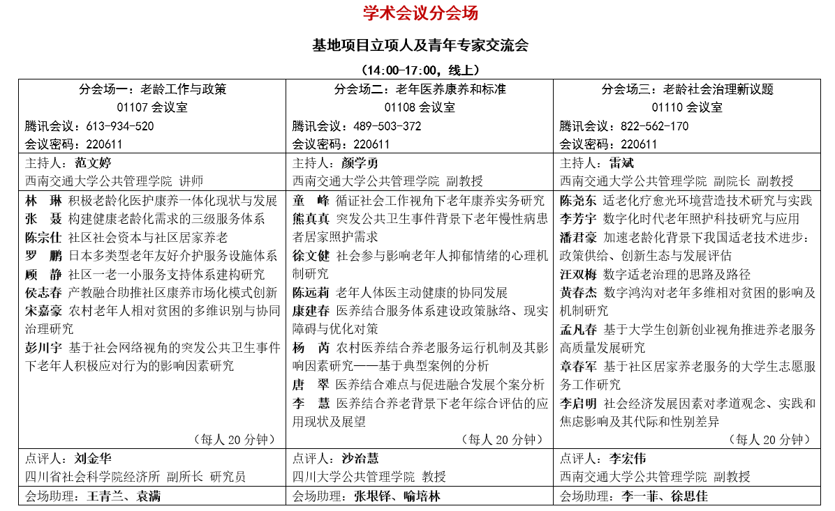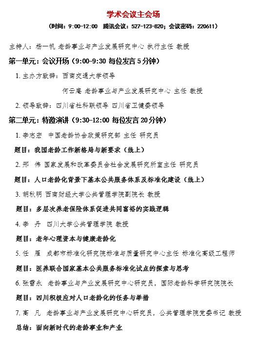四川省社会科学重点研究基地与四川省老年学学会、成都市成华区医养联合基本公共服务标准化试点工作领导小组、成都市标准化研究院等单位联合举办2022年度学术会议。本届年会以“积极老龄 医养联合 标准引领”为主题,邀请政府、学界、企业、社会组织等专家齐聚一堂,就四川积极应对人口老龄化战略中的政策趋势、医养康养、标准建设、质量提升等议题深入研讨。