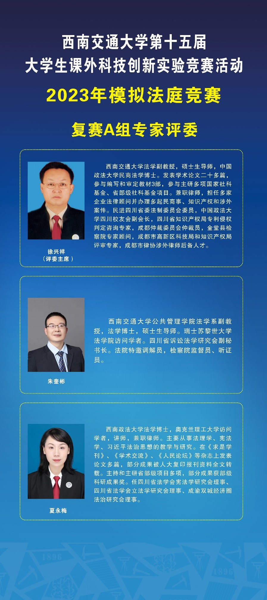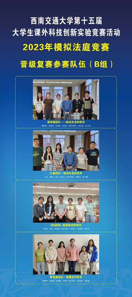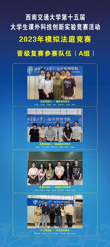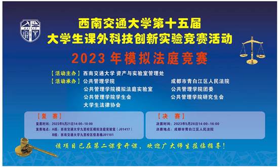 2023年模拟法庭竞赛于4月初拉开帷幕,本次竞赛案例由成都市青白江区人民法院提供,模拟法庭张荣荣老师改编。我校研究生、本科生组成共18支参赛队参加了本次模拟法庭竞赛。在初赛中各参赛团队根据竞赛案例案卷材料,提交了包括民事起诉状、民事答辩状、代理意见书、类案检索报告等200多份司法文书,由青白江区法院三位民庭庭长进行匿名评审,8支参赛队成功晋级,现通过抽签方式,分为A、B两组展开复赛。现对模拟法庭竞赛复赛赛事安排如下: