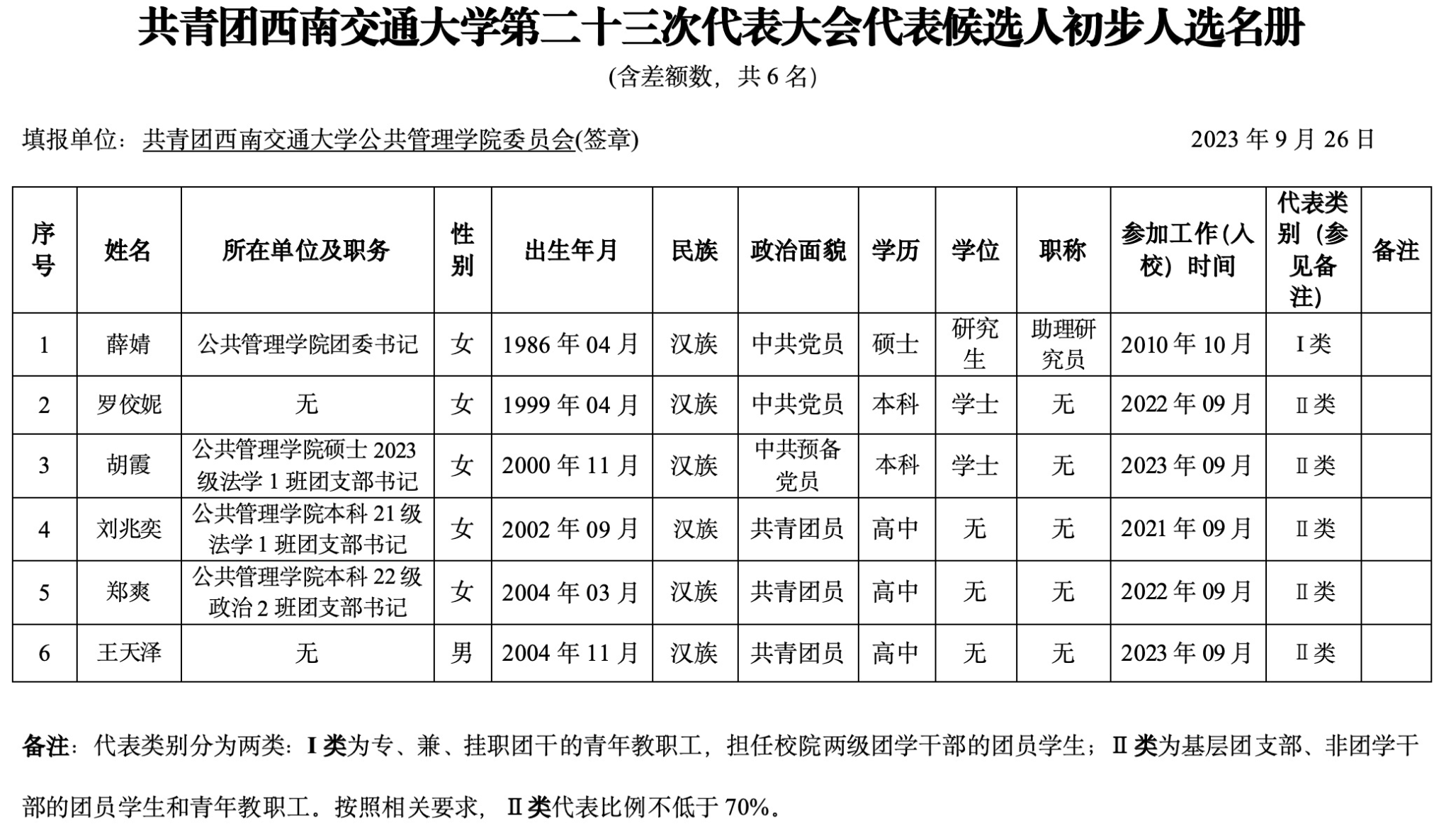 的代表名额及构成要求,结合实际情况,经基层团组织推荐、广泛协商酝酿和组织考察、集体研究,初步候选出以下6名同志作为共青团优视频
