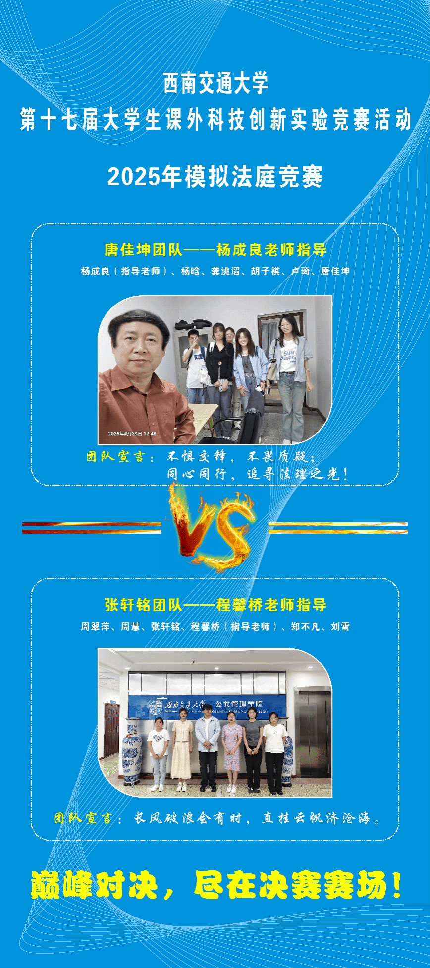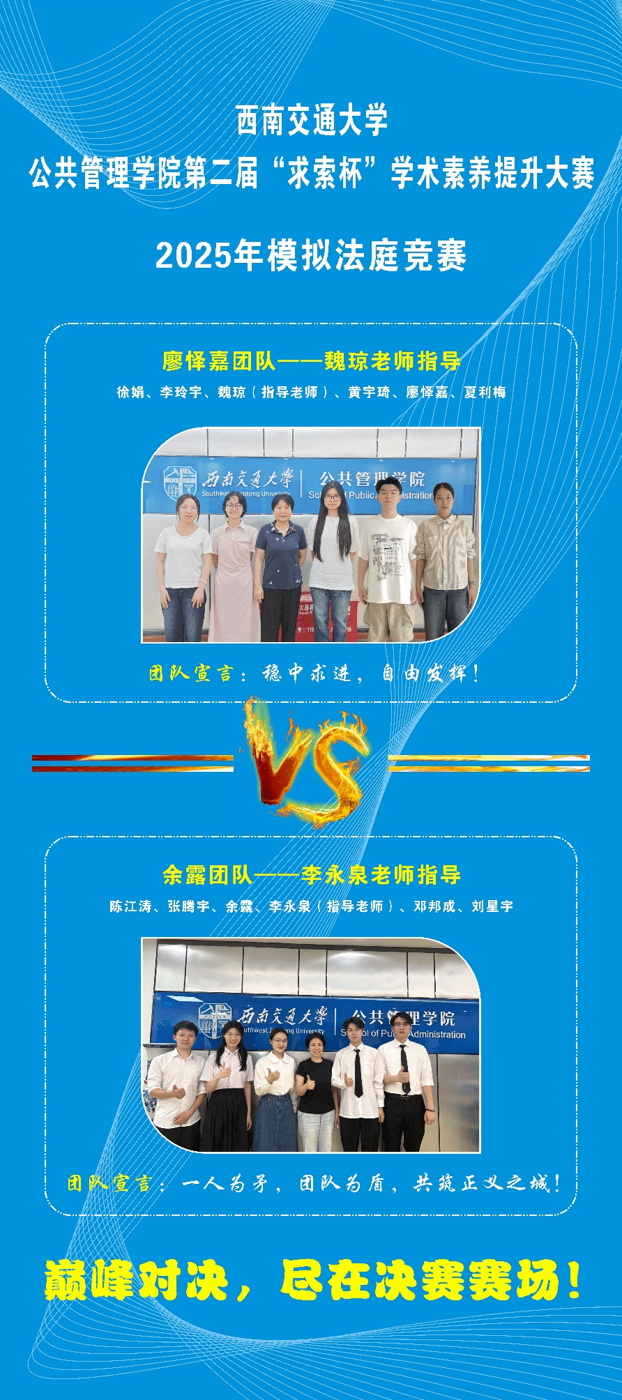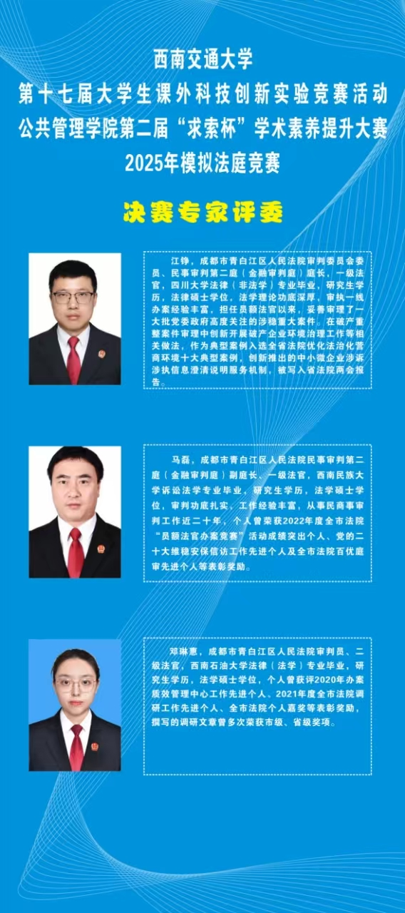 、成都市青白江区人民法院承办的第二届“求索杯”学术素养提升大赛(研究生)2025年模拟法庭竞赛在4月初拉开帷幕,初赛中青白江区人民法院的三位法官对28支参赛团队提交的司法文书进行了专业评审,16支参赛团队脱颖而出晋级复赛,经过复赛4个赛场的言辞辩论评审,2支本科生参赛队和2支研究生参赛队晋级模拟法庭竞赛决赛,现对决赛赛事安排如下: