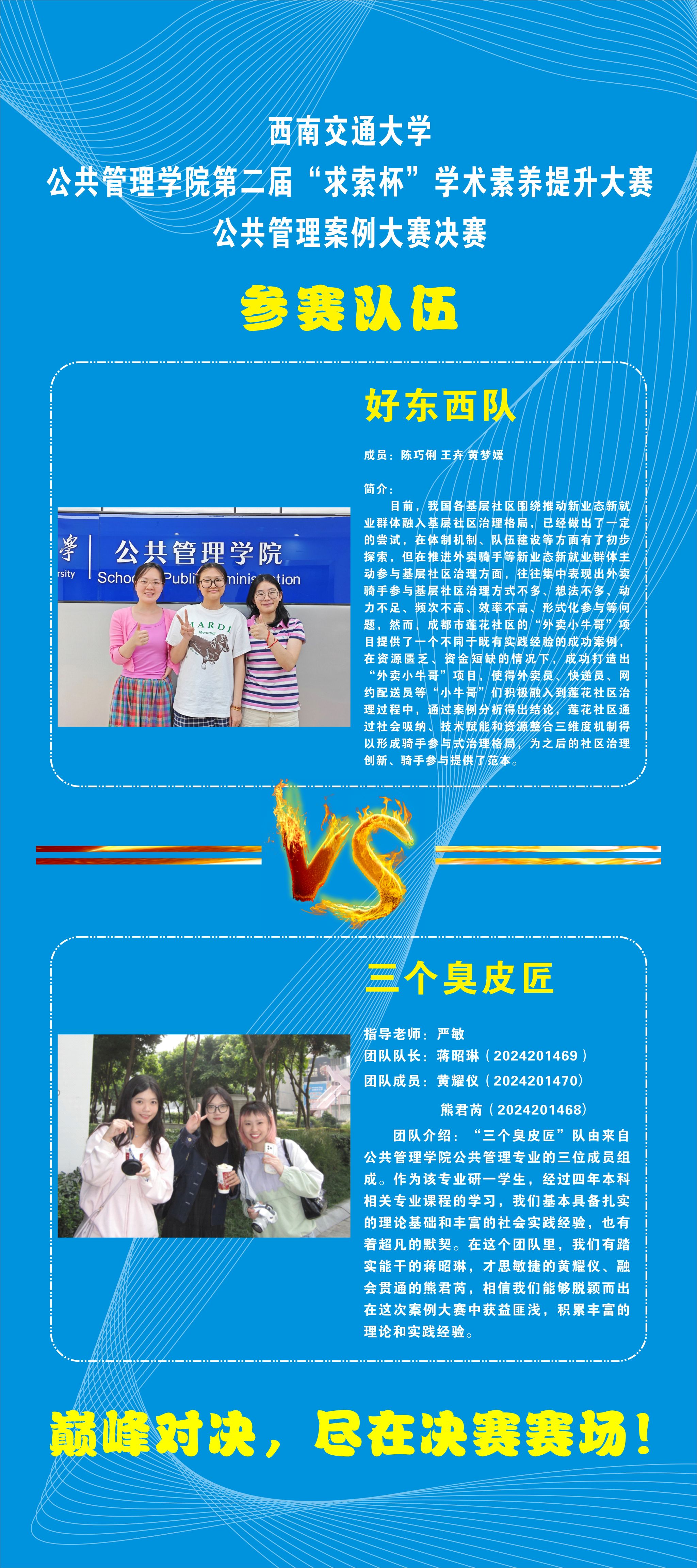 在复赛评选中,在导师回避、专业匹配的原则下,经过6名专家评审,两个分赛场组分别有一支参赛团队晋级第二届“求索杯”学术素养提升大赛——公共管理案例大赛决赛,现对决赛赛事安排如下: