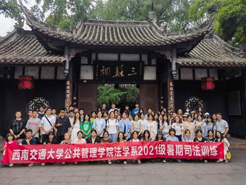 为深入学习贯彻党的二十大精神,扎实开展好学习贯彻习近平新时代中国特色社会主义思想主题教育,同时进一步增强法学专业学生的实践能力和综合素养,提升同学们理论与实践相结合的能力,深入了解法院的组织构成和运行模式,7月2日至3日,2021级法学专业全体同学在法学系杨道现老师带领下赴眉山市三苏祠以及彭山区、东坡区人民法院开展司法训练。