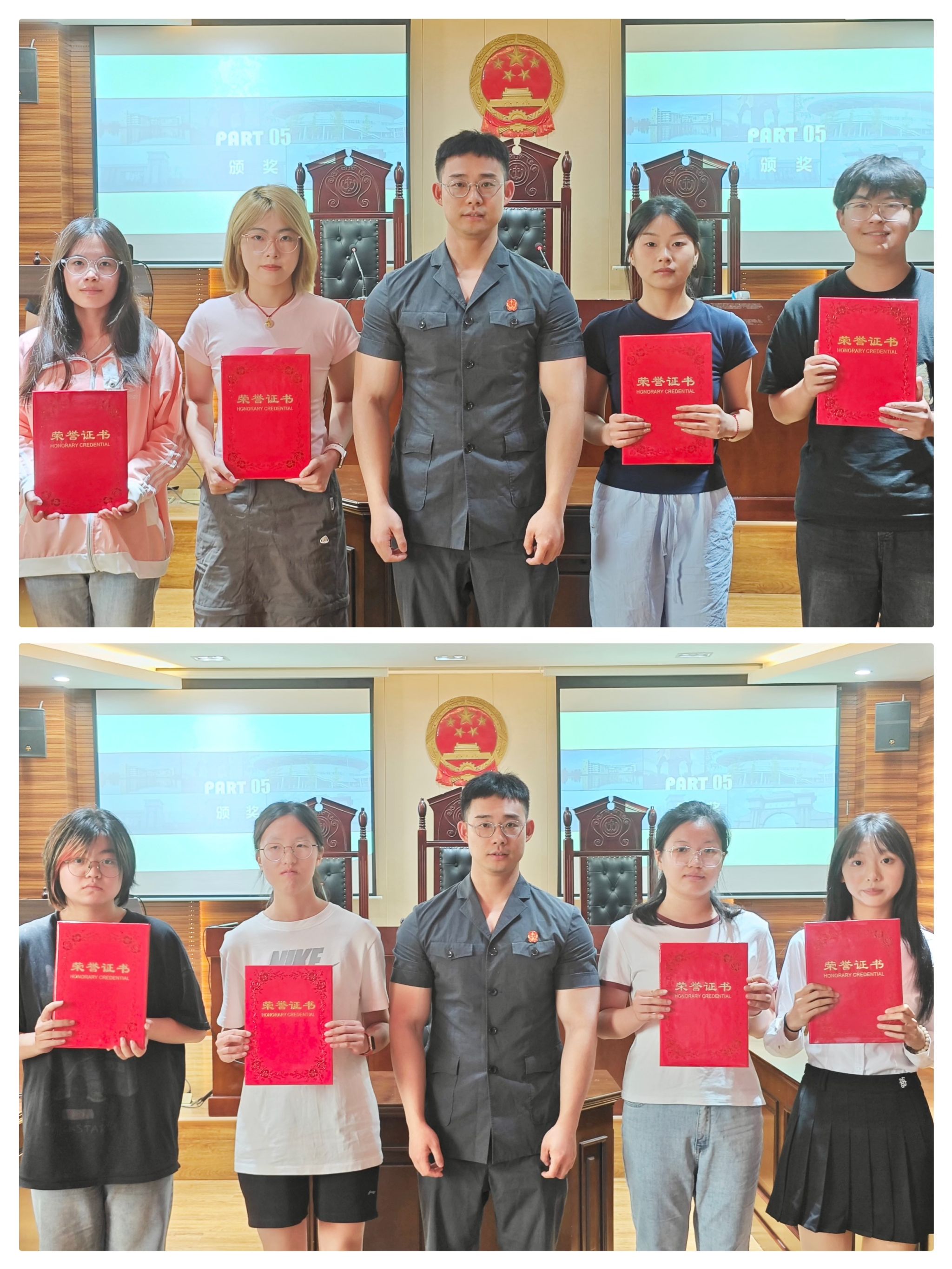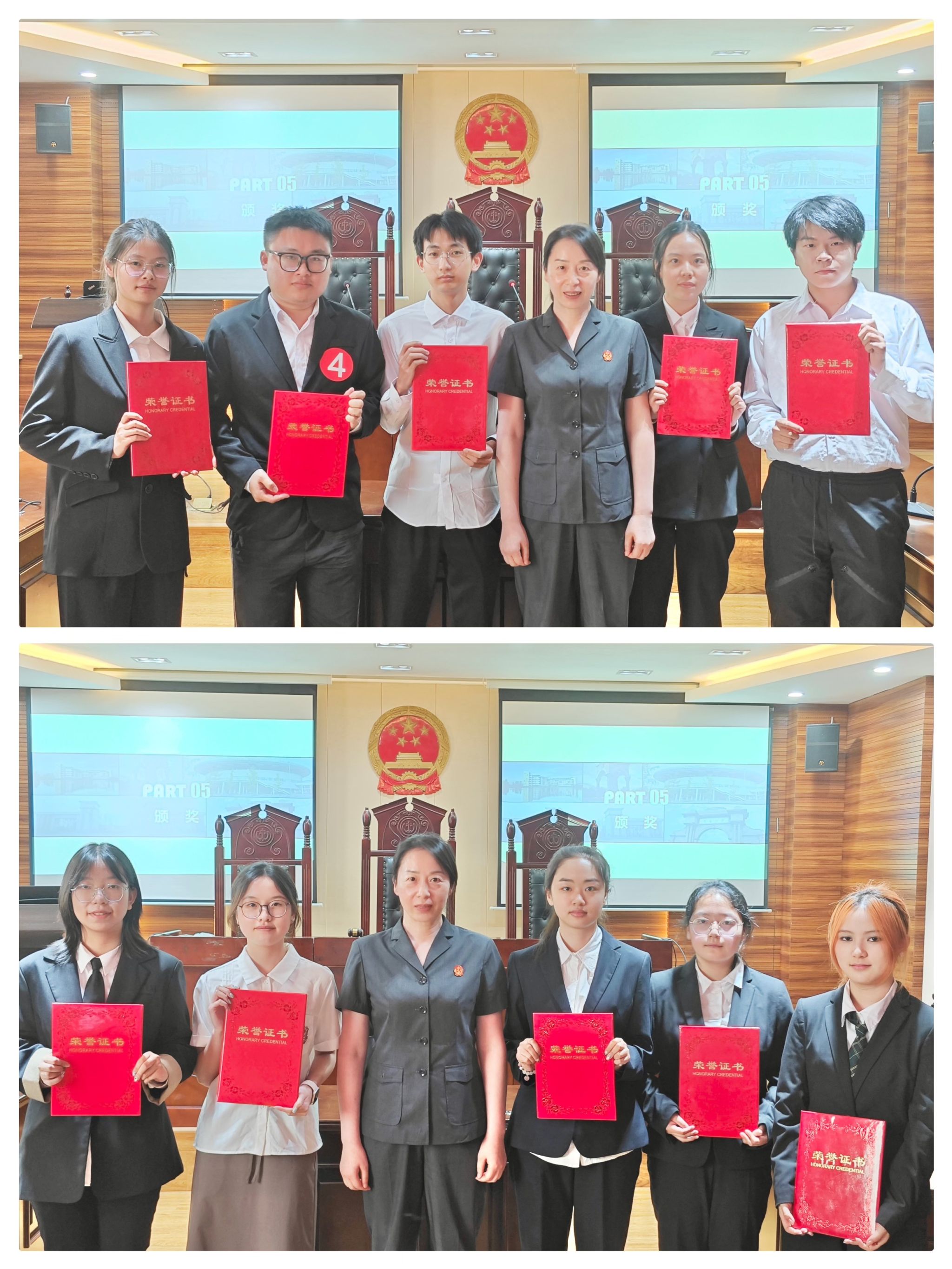 赛事已经接近尾声,王庭长宣布了决赛两支参赛团队的最终成绩和本次模拟法庭竞赛的获奖情况:杜星瑶团队荣获本次模拟法庭竞赛的冠军,高博团队获得亚军,两支参赛团队双双荣获一等奖;刘雨晨、康雪雪两支参赛团队荣获二等奖;张瑞轩、刘瑾仪、曾梓涵、王涵玉四支参赛团队荣获三等奖,陈佳佳、叶思宁两支参赛团队荣获优胜奖。最后,祝院长、王庭长、刘庭长和张法官分别为获奖队伍颁奖并与参赛团队合影留念。