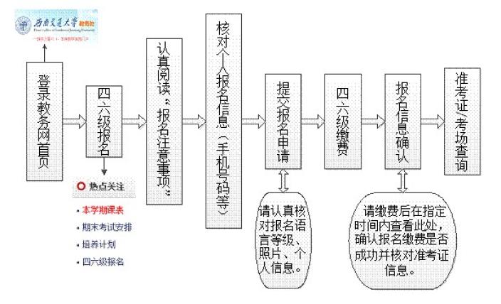 1、报名请登陆四、六级考试报名系统(网址://202.115.71.131/Cet/student/index.jsp),本科生用户名和密码分别为学号和教务网密码,其他学生用户名和密码为学号和身份证号码。