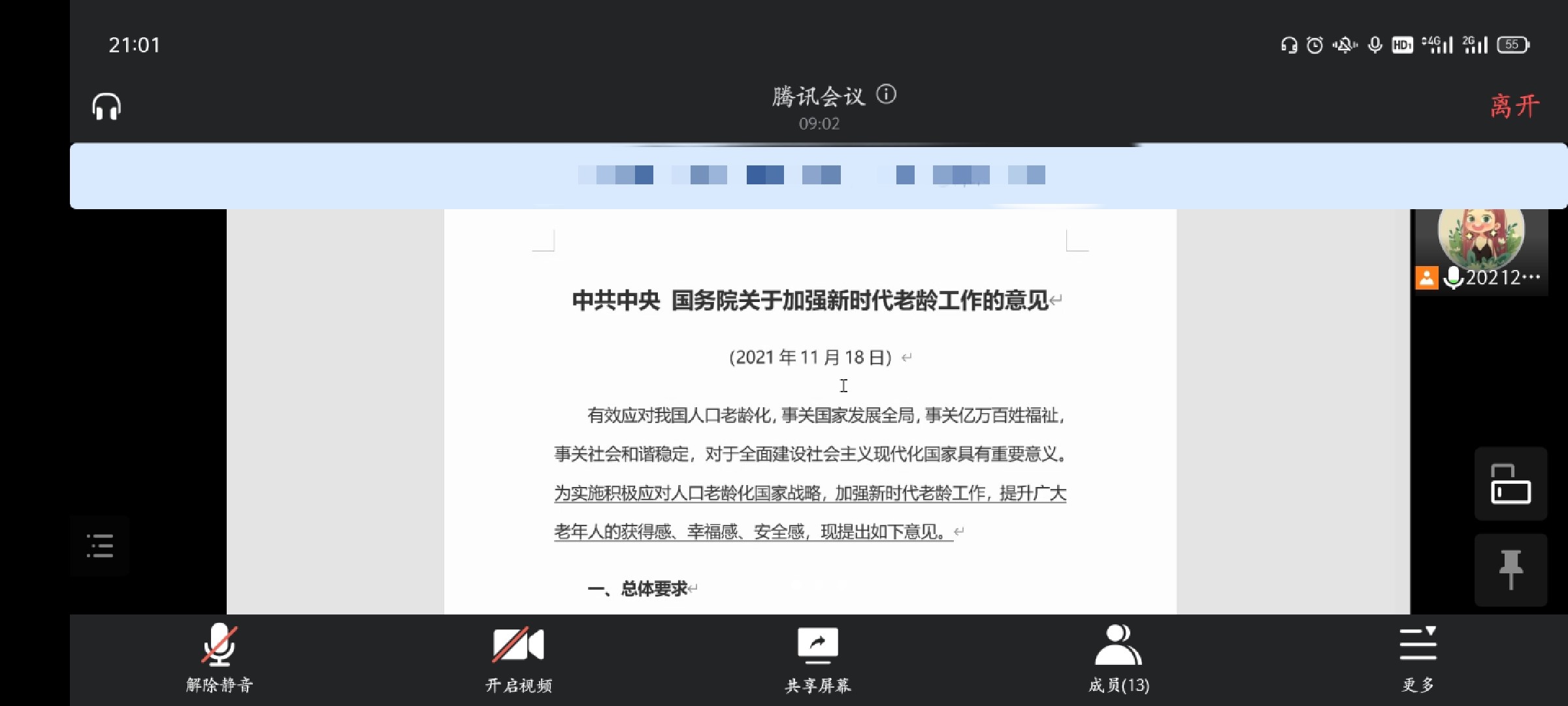 有效应对我国人口老龄化,事关国家发展全局,事关亿万百姓福祉,事关社会和谐稳定,对于全面建设社会主义现代化国家具有重要意义。硕士2021级法学第一党支部全体党员同志于2021年12月7日晚21:00在线上腾讯会议开展了《中共中央国务院关于加强新时代老龄工作的意见》的学习活动。
