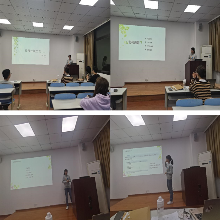 首先是黄同志进行“投稿经验交流”分享。黄同志在校期间,发表中文核心期刊一篇,其着重分享中文期刊投稿经验,从论文选题、写作、期刊筛选、投稿等一一阐述。她讲到“选题、写作、投稿是一个循序渐进的过程,没有哪一个阶段是轻松的。选题时多和导师沟通交流,多阅读高质量文献,写作时要沉得住寂寞,坐得住冷板凳;投稿时要有耐心,坚持不懈”。的确,科研本身是一件严肃的事情,其不仅可以锻炼同志们的写作技巧,并且可以提升同志们的逻辑思维水平。科研的道路道阻且长,但如果你真的有兴趣且毅力卓然,定要发挥自己特长,坚持在自己的领域发光发热。