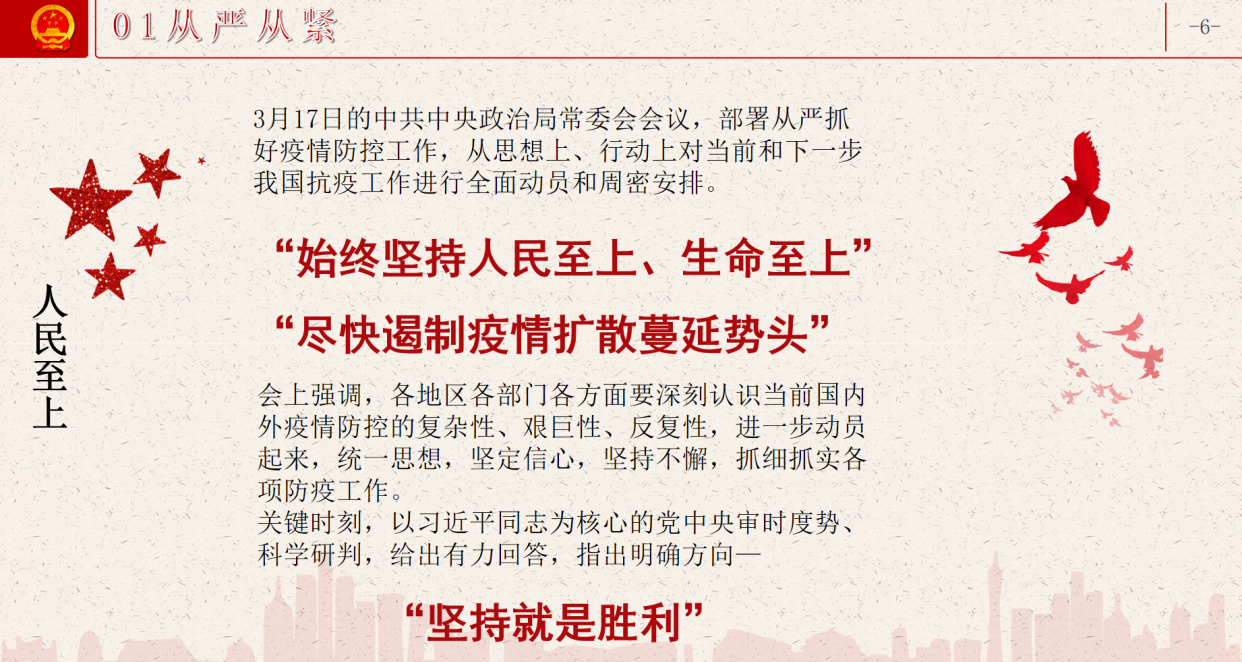 在第一部分“从严从紧——始终绷紧疫情防控这根弦”中,我们从意识形态加深了对疫情的认识,深刻了解到党中央层面始终坚持抗“疫”不松懈的原则,对疫情防控的决心与毅力。