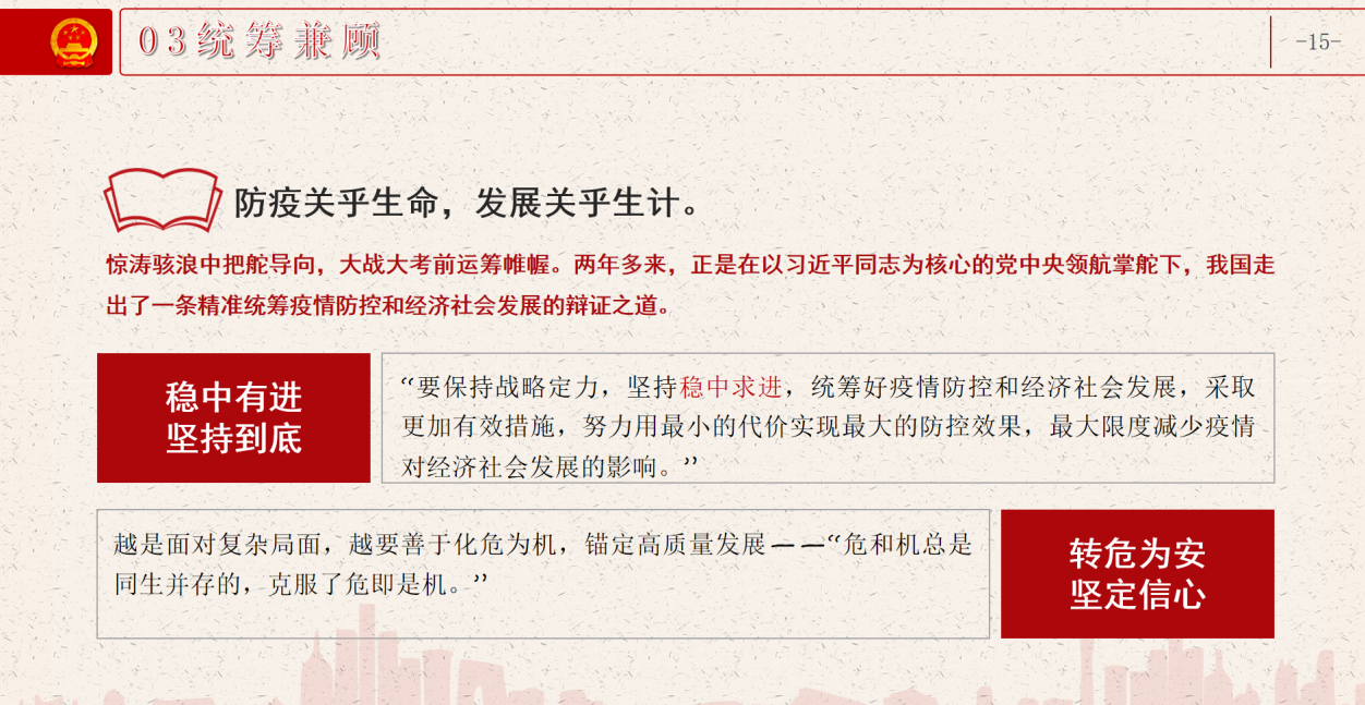 在第三部分“统筹兼顾——最大限度减少疫情对经济社会发展的影响”中,我们学习到在党中央的领导下,我国走出了精准防控与经济社会发展的辩证之道。面对突如其来的疫情,中国经济并没有被疫情拖垮,反而在疫情之下,我们坚韧地抗击,化危为机,瞄定高质量发展;稳中有进,坚持人民至上。