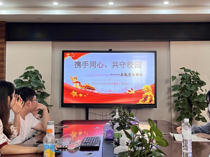 为学习2022年3月29日人民日报刊发的《习近平总书记指挥打好统筹疫情防控和经济社会发展之战述评》,教育引导支部党员正确认识当前疫情防控形势,坚决服从学校疫情防控工作安排,坚决听从指挥,严格落实“非必要、不离校”的要求,自觉配合学校疫情防控工作的开展。2022年4月12日下午,硕士公共管理2021级第二党支部全体党员同志参与”携手同心,共守校园“主题党日活动,此次活动由党支部书记张婷主讲。