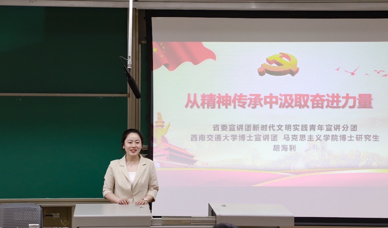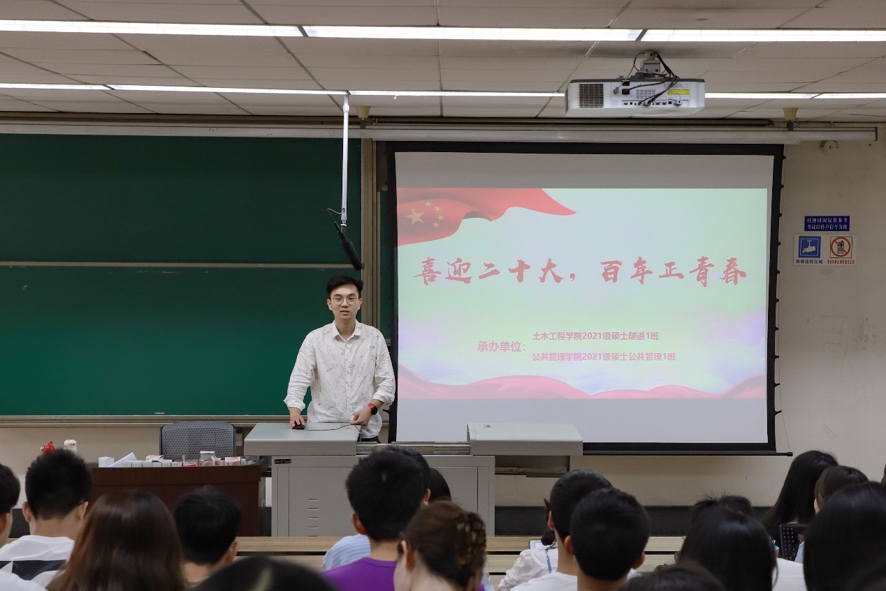 为学习贯彻党的十九届六中全会精神,深入领会党和国家事业取得的历史性成就、发生的历史性变革,坚定奋斗报国志向,以青春之姿、蓬勃之势、昂扬之态喜迎党的二十大,硕士公共管理第一党支部和土木工程学院2021级硕士隧道1班于5月9日下午在九里校区4219联合举办了“喜迎二十大,百年正青春”主题党日活动,此次活动邀请到了马克思主义学院宣讲团的刘丽虹和胡海利两位师姐为大家做《中国共青团的历史价值和时代使命》与《从精神传承中汲取奋进力量》的主题宣讲。