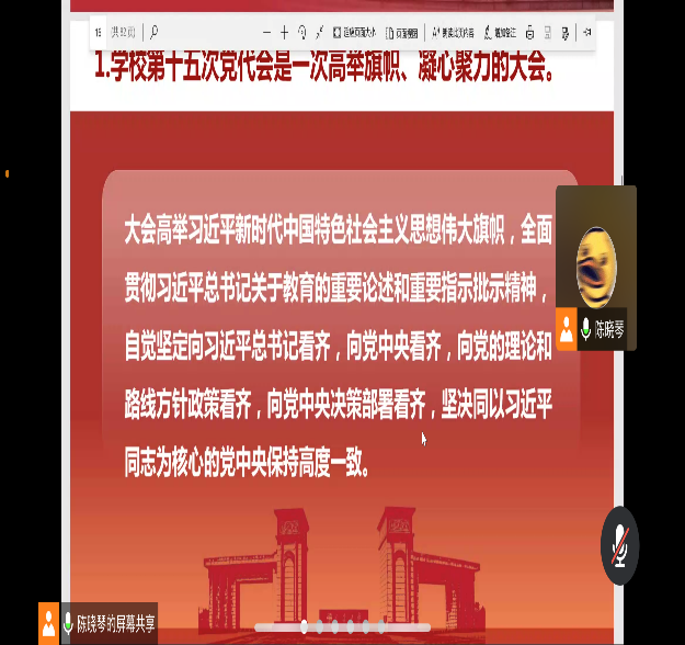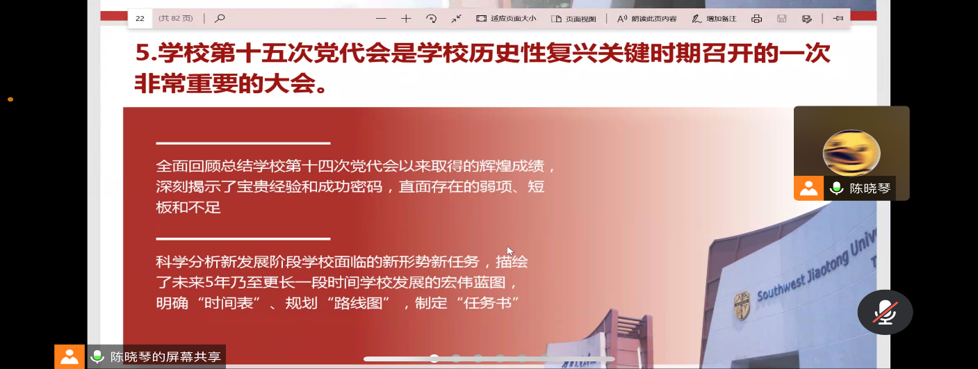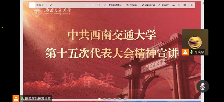 第十五次党代会精神热潮,推进“踔厉奋发、笃行不怠,谱写中华民族伟大复兴的西南交大新篇章”主题学习教育实践活动,硕士2020级公共管理第一党支部于2022年10月13日晚19:00在腾讯会议开展“学习党代会精神,书写新青年篇章”的主题党日活动,以实际行动迎接党的二十大胜利召开。会议由党支部书记陈晓琴主持,全体党员同志参加。会议主要从大会主题、工作回顾、新时期办学治校总体思路、科学谋定学校的发展目标等方面展开。