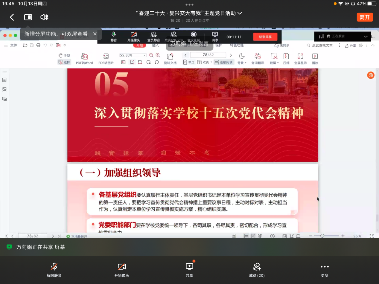 首先,万莉娟同志向支部成员们介绍了学校第十五次党代会基本情况,带领大家共同学习了王顺洪书记的报告、中共优视频