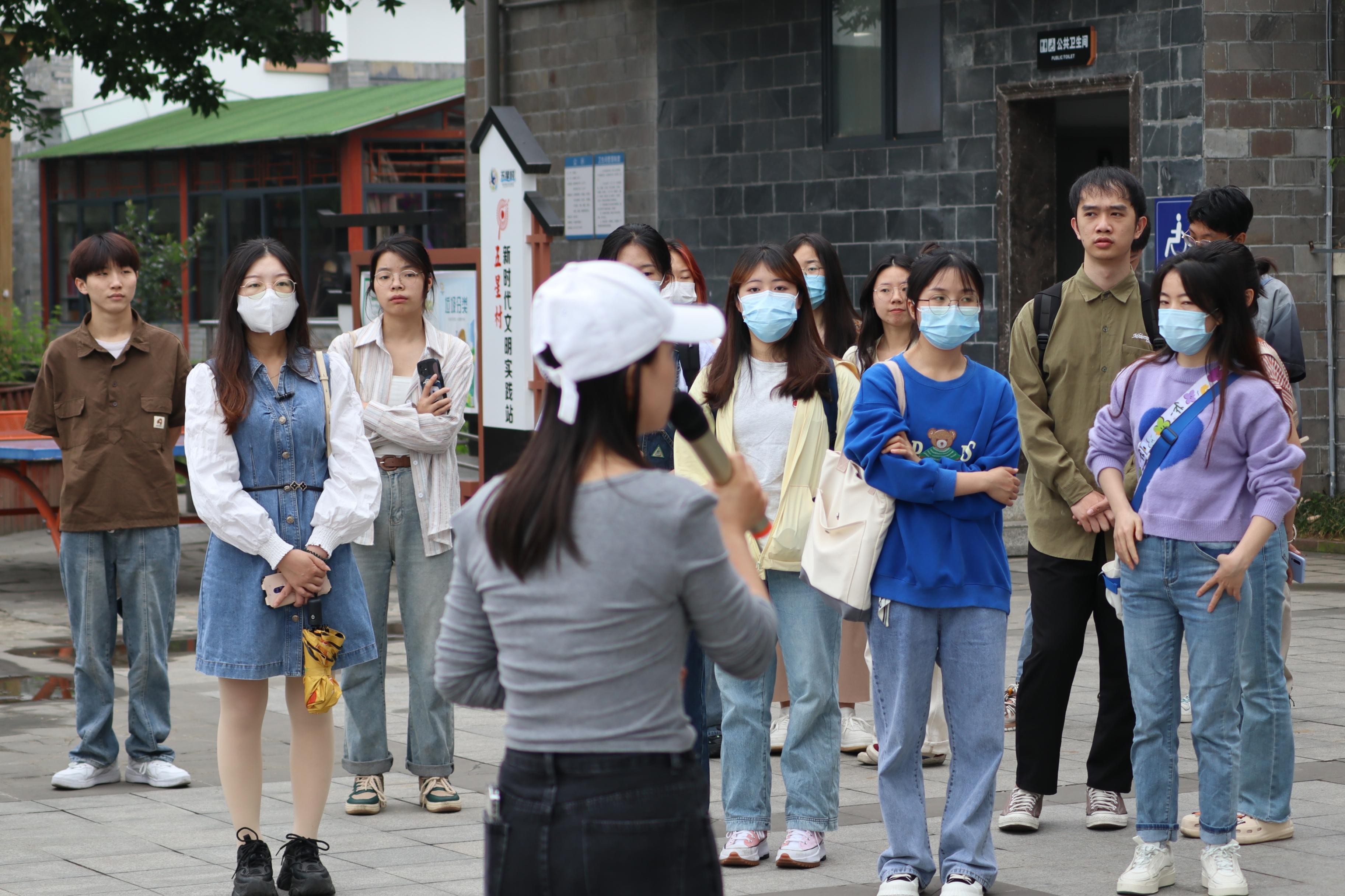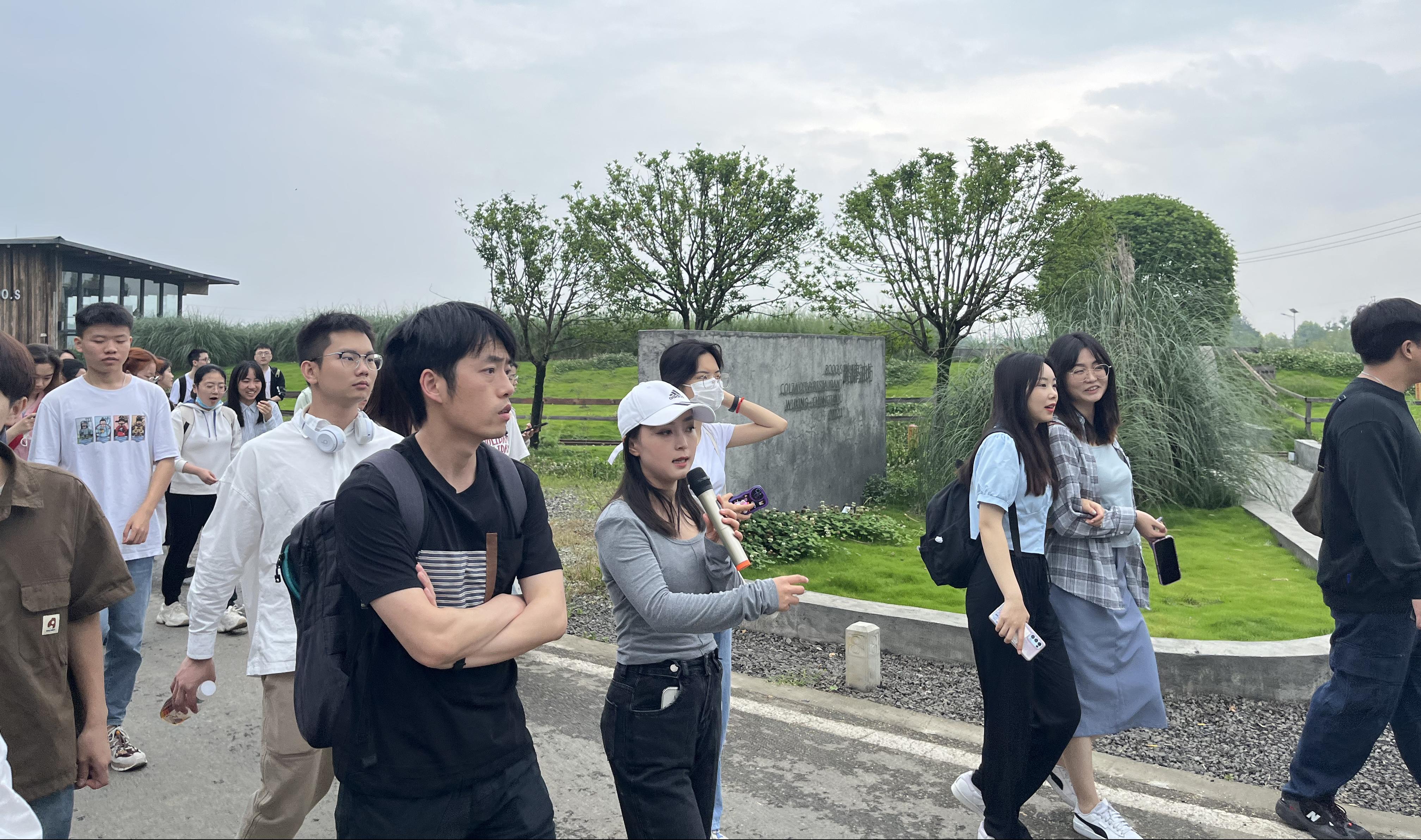在实践调研中,负责老师向师生们介绍了五星村坚持“龙头企业+集体经济组织”的共同发展模式,通过组建天府国际慢城农文旅联盟,依托天府国际慢城数字乡村智慧旅游平台,创新旅游业态运营模式,五星村初步建成了一条北起白塔湖与无根山,南至光华大道,环抱白头的翡翠绿链。负责老师谈说:“现在五星村人气旺了,投资也来了,产业发展随即起来了,外出打工的人们都回来了,村里渐渐富起来了,我们家家户户在门口就过上了‘五星级’生活。”谈到村里的变化,讲解老师由衷地为自己家乡感到自豪。