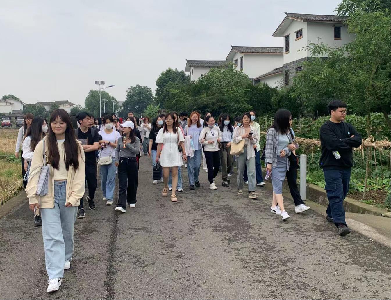 在负责老师的解说引导下,同学们走过五星村建成的高标准农田、优质粮油基地,大片景色映入眼帘,大家被秀美的桤木河湿地公园、浪漫的花海稻香田野所包围;被街区上有着青瓦白墙、雅院小楼的形态所深深吸引。“五星村的建设让我感觉很惊讶,没想到乡村建设也可以这么完善这么齐全!”一位同学惊叹道。村口处,一个象征“慢生活”的几米高的巨大蜗牛造型吸引同学们驻足留影。