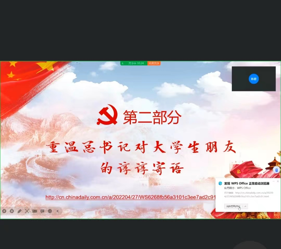 6月11日晚,硕士2021级公共管理第二党支部在钉钉会议召开“习近平总书记与大学生在一起”主题党日活动,参会正式党员19人,预备党员5人,由党支部书记疏金金同志领学,学习内容如下。