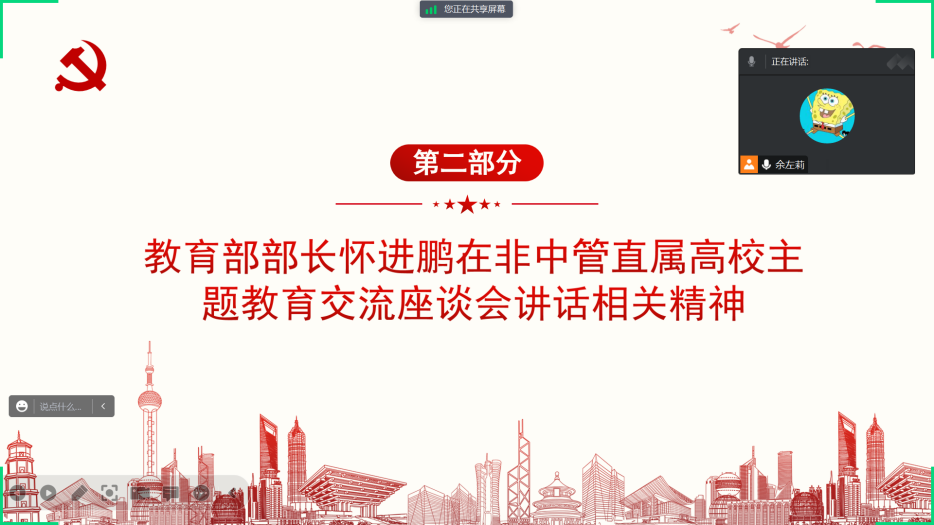 活动第二部分是由支部书记向与会党员传达了“教育部部长怀进鹏在非中管直属高校主题教育交流座谈会讲话相关精神”。怀进鹏强调,中央主题教育工作会议召开以来,习近平总书记多次发表重要讲话,指导推动主题教育往深里走、往实里走、往心里走,高校领导干部要紧密结合学习贯彻习近平总书记在中共中央政治局第五次集体学习时的重要讲话精神,迅速带头专题学习,全面理解精髓要义,深刻把握实践要求,锚定建设教育强国目标任务,把自己摆进去,把职责摆进去,把工作摆进去,进一步深化以学铸魂、以学增智、以学正风、以学促干,努力把主题教育成效转化为实实在在的工作成果。学习完两部分内容后,与会党员就讲话内容展开了热烈的讨论。