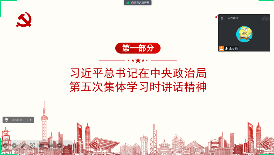 本次活动分为两个部分,活动第一部分是集体学习“习近平总书记在中央政治局第五次集体学习时讲话精神”。支部书记强调,全体党员同志要深刻理解和把握习近平总书记重要讲话精神的丰富内涵、重大意义,深刻领悟“两个确立”的决定性意义,增强“四个意识”、坚定“四个自信”、做到“两个维护”,把思想和行动统一到总书记重要讲话精神上来。
