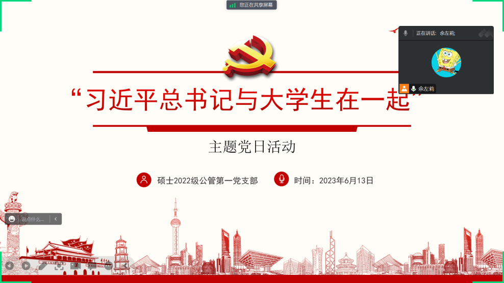 2023年6月12日,硕士2022级公共管理第一党支部在线上开展了主题为“习近平总书记与大学生在一起”的党日活动。本次活动由党支部书记余左莉同志主持。