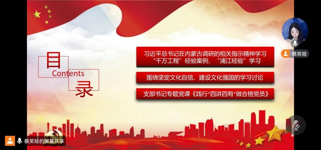 本次党日活动共设三个议程。首先由黄靖同志领学习近平总书记在内蒙古调研时对抓实以学正风、解决突出问题有关要求和指示精神、“千万工程”经验案例,学习运用好“浦江经验”;然后由汪双梅和程婷同志组织全体党员围绕坚定文化自信、建设文化强国进行学习讨论;最后由蔡笑晗同志讲授主题教育专题党课《践行“四讲四有”做合格党员》。