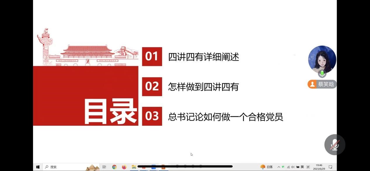 最后一项议程由蔡笑晗同志主持,为支部党员讲解《践行“四讲四有”做合格党员》主题的专题党课。“四讲四有”是一名合格党员的核心要素,是新时代党员党性的客观要求,是在党爱党、在党护党、在党兴党、在党为党的现实体现,为如何做一名合格党员指明了方向。关于其具体内涵,蔡笑晗同志分别做出了细致的讲解:“讲政治、有信念,讲规矩、有纪律,讲道德、有品行,讲奉献、有作为。”