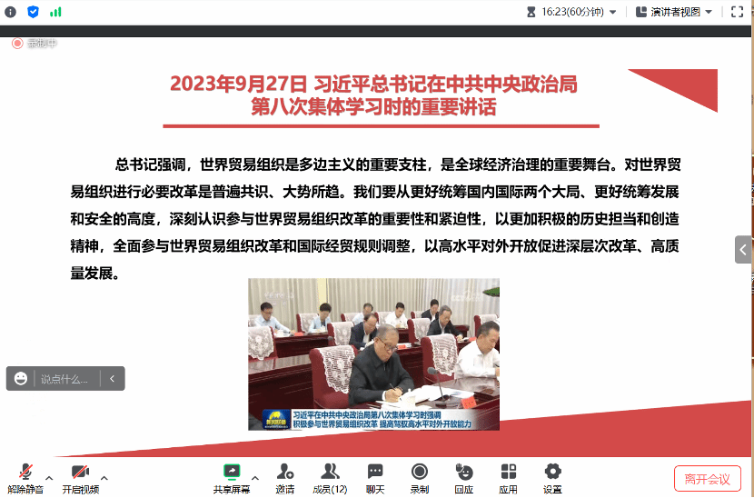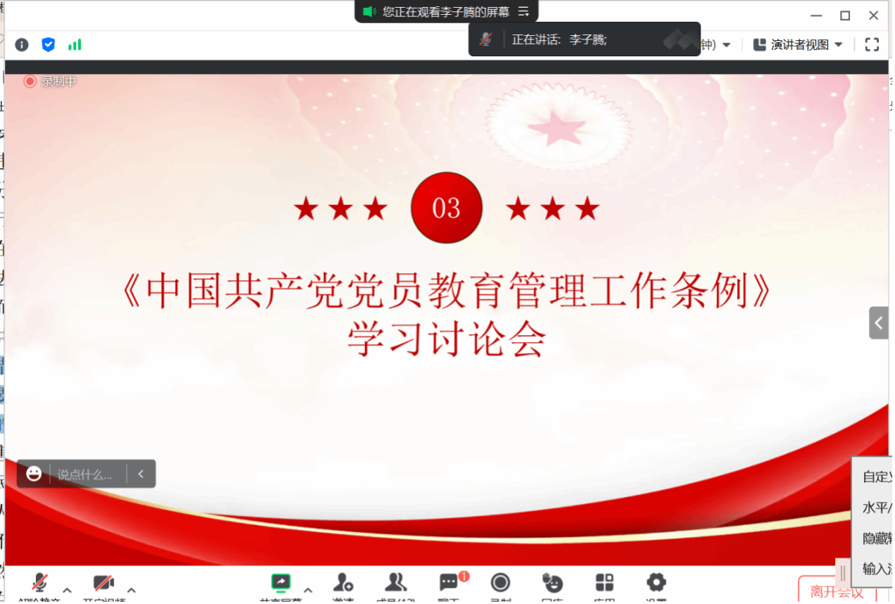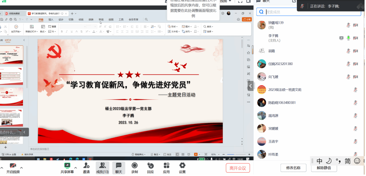 为深入学习贯彻习近平新时代中国特色社会主义思想和习近平总书记关于主题教育的最新重要讲话精神,推动主题教育成果入脑入心,硕士2023级法学第一党支部于2023年10月26日19:00于腾讯会议线上开展“学习教育促新风,争做先进好党员”的主题党日活动,对党的先进理论和《中国共产党党员教育管理工作条例》(以下简称《条例》)进行学习。本次党日活动由党支部书记李子腾同志主持。