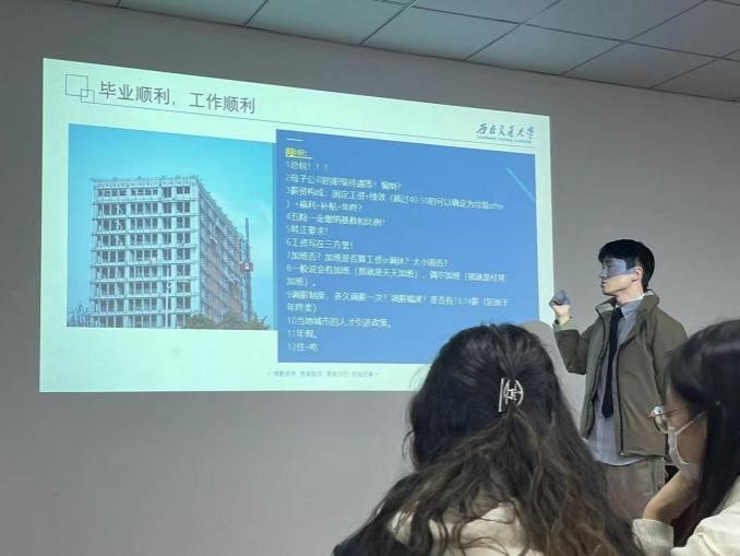 最后来到党日活动的第三个环节,支部邀请了疏金金同志为全体党员带来秋招就业的经验分享交流。疏金金同志从就业信息渠道讲起,为大家介绍了5种就业信息渠道,还介绍了面试技巧和简历制作。就目前毕业生党员关切的五险一金问题,疏金金同志为大家作了详细的介绍:签约时应重点关注的细节、具体的缴纳比例、缴纳的注意事项等。他还结合了自己听宣讲会、找工作的经历为大家分享哪些机会需要抓住、哪些情况需要“避雷”等,大家受益匪浅。