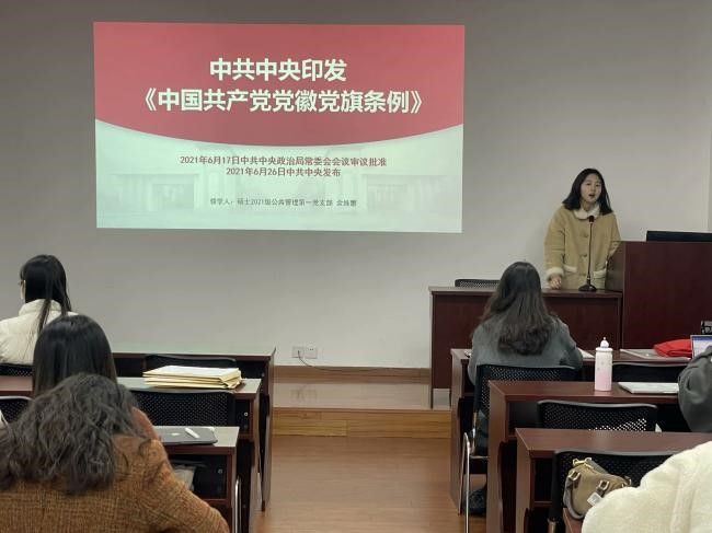 本次党日活动共设三个环节,第一个环节由硕士2021级公共管理第一党支部的余姝蕙同志领学《中国共产党党徽党旗条例》。余姝蕙同志首先介绍到了中共中央印发《中国共产党党徽党旗条例》的背景和必要性,她指出“中国共产党的党徽党旗是中国共产党的象征和标志。维护党徽党旗的尊严,就是维护党的尊严,是各级党组织和每名党员必须履行的政治责任”。她还为各位与会同志介绍到党支部在使用党徽党旗的注意事项。