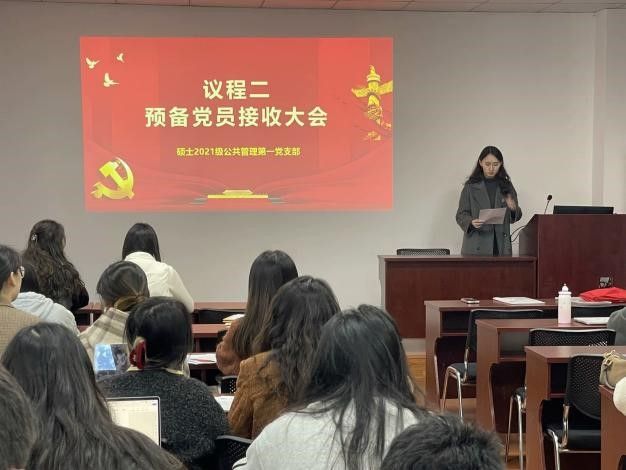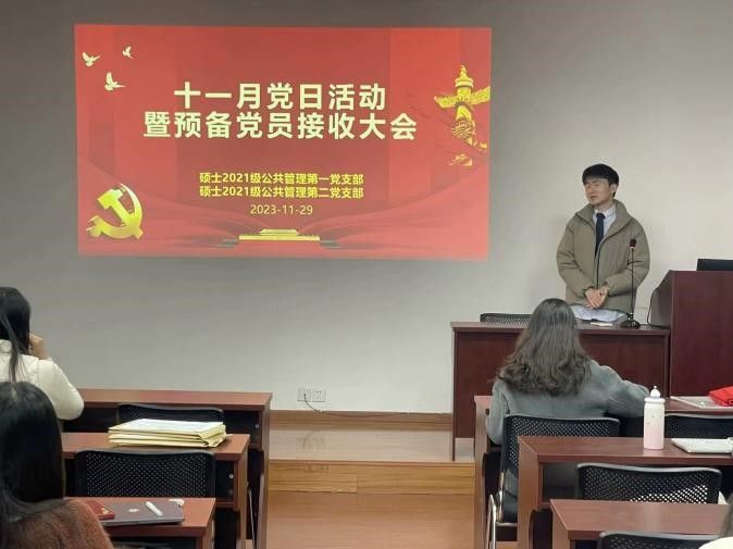 为响应党的号召,培养优秀党员,2023年11月29日,硕士2021级公共管理第一党支部联合硕士2021级公共管理第二党支部于01105教室召开11月主题党日活动,并分别进行预备党员接收大会,为方便目前省内外党员参会学习,本次党日活动采取线上线下结合的方式。会议由硕士2021级公共管理第二党支部书记疏金金同志主持。