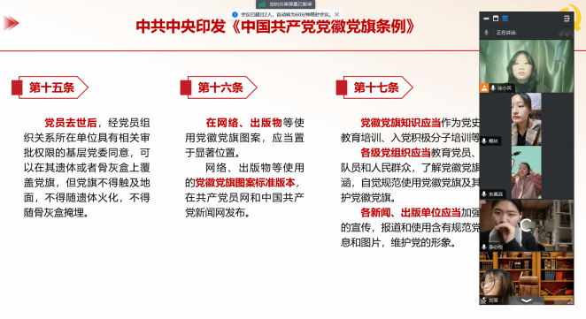 其余小组选择线下集中的方式,在教室内围绕《建设开放包容、互联互通、共同发展的世界》和《中国共产党党徽党旗条例》,分专题进行研讨,并且以逐条领读、专项报告等形式开展学习。每位同学在学习后都轮流在讲台上进行了三分钟的感悟分享,同学们分别从自身出发,从理论出发,谈作为青年党员应该如何参与到美好世界建设、担当起自身责任。在有关《中国共产党党徽党旗条例》交流中,不少同学提到:之前对于党徽党旗缺乏正确的认识,通过本次学习已经能够正确认识党徽党旗的深刻内涵与工作要求,并且在今后的工作生活中会规范使用党徽党旗及其图案。