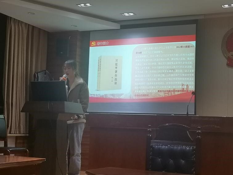 紧接着,与会的三位研究生党员代表依次上台作读书分享。第一位党员代表叶雨柔同志为全体与会党员作了关于《习近平新时代中国特色社会主义思想学习纲要(2023年版)》的读书分享,为我们详细介绍了这本著作的主要内容和重大意义;第二位党员代表赵金涛同志为全体与会党员作了《习近平谈治国理政》第四卷的读书汇报,为我们分享了关于这本著作的时代内涵和精神价值;第三位党员代表卿三春同志为全体与会党员作了关于《习近平著作选读》的分享汇报,深刻解读了近十年来的伟大成就。