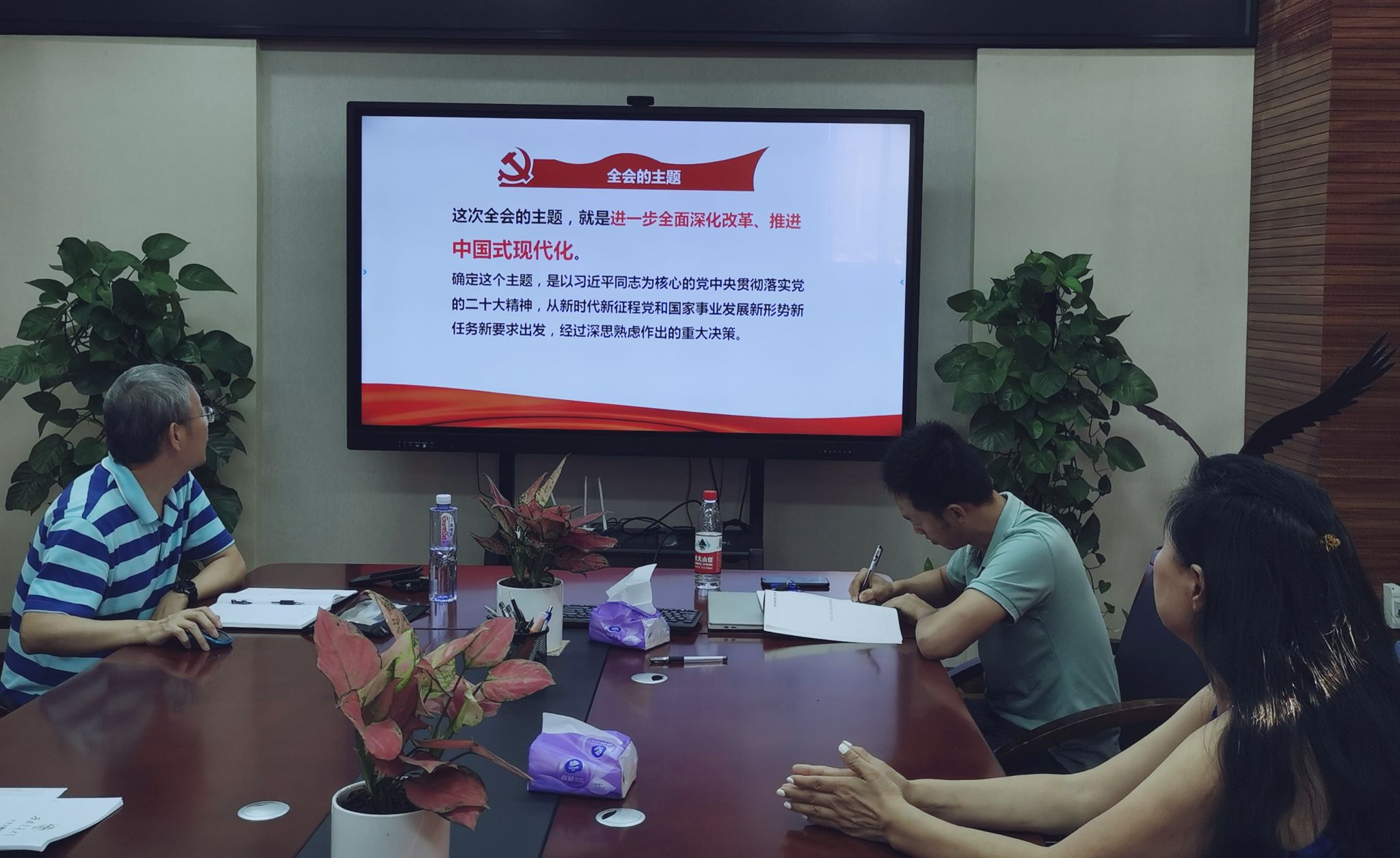 专题分享后,与会同志一一发表了理论学习感想,并共同讨论如何将党的二十届三中全会精神融入中心的日常活动和学术科研中,从而更好地将《决定》中的相关举措落地落实。