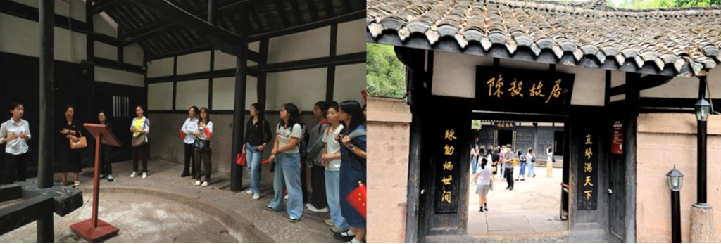 走出陈列馆,已然下起了小雨,而陈毅故居为师生们遮蔽了风雨,留下宁静之所。陈毅故居是一个具有浓郁川中民居风格的三重堂四合院。伟大的无产阶级革命家、政治家、军事家、外交家、诗人,中国人民解放军的创建者和领导人之一、党和国家的卓越领导人陈毅元帅,就出生在这个院子里。大门中央有邓小平同志亲笔题书陈毅故居匾额,行至二进院落,对联写着陈毅家训“继先辈辛勤创业,启后人耕读传家”。家风传万代,精神由此来。师生们不禁想起陈毅同志的诗作《青松》:“大雪压青松,青松挺且直。要知松高洁,待到雪化时。”