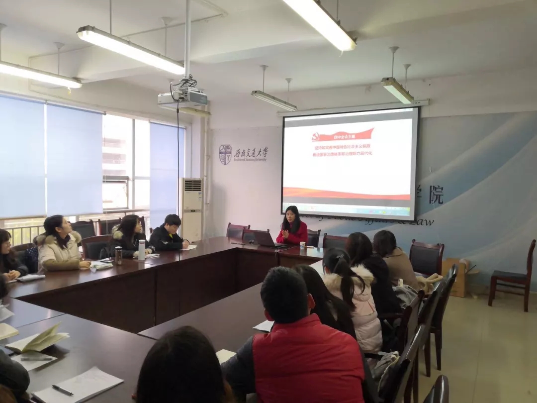 2019年11月29日下午1点,公共管理与政法学院本科第一党支部积极响应党中央号召、深入学习党的十九届四中全会精神,于X2401举行贯彻党的十九届四中全会精神专题学习会议,本次会议由公共管理与政法学院党委余小英副书记主讲,支部书记谢元桃同志主持。