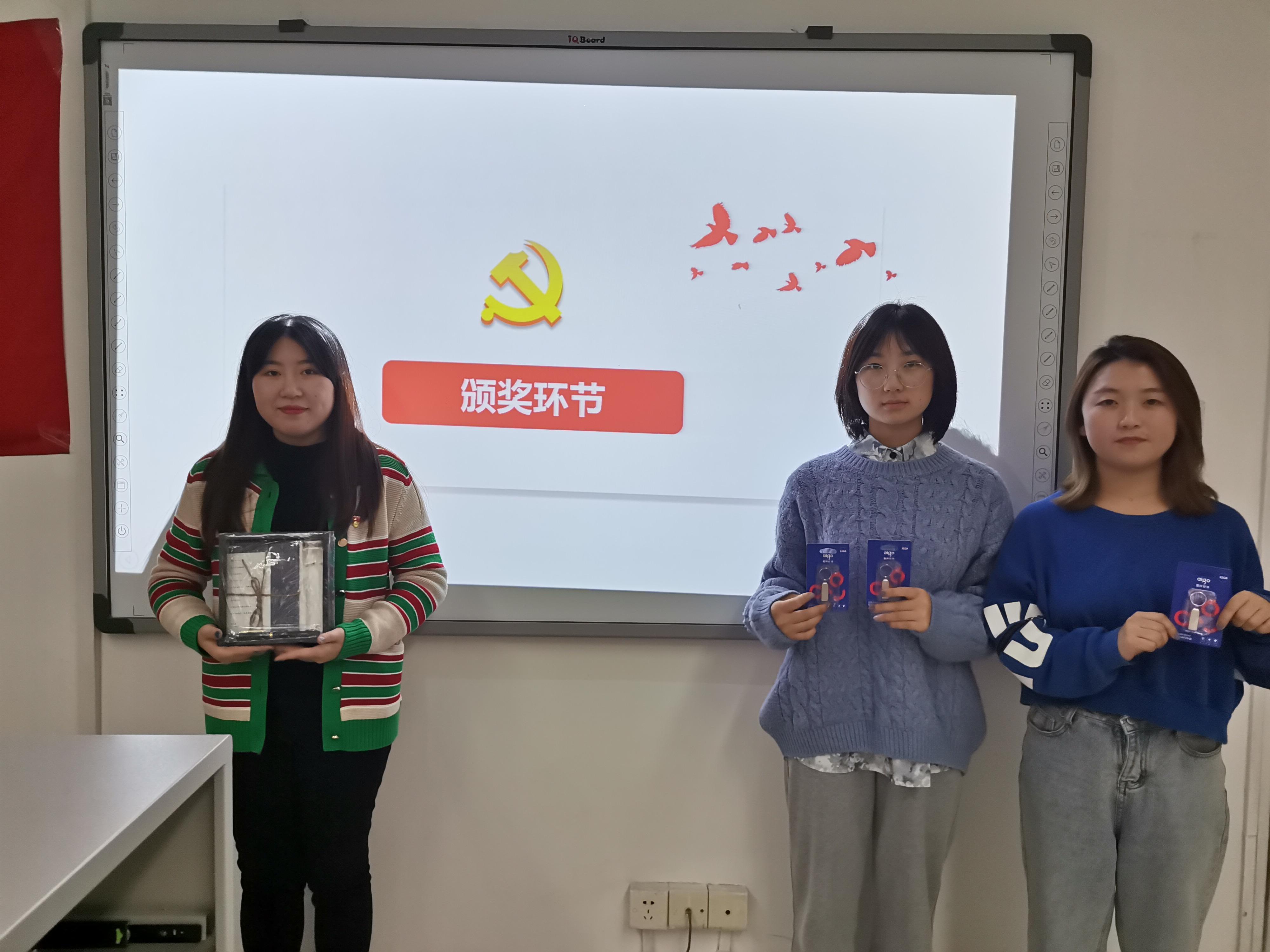 最后,由党支部书记对本次学习进行总结并对表现优秀者发奖品。通过此次活动,同学们的思想得到了历练。不仅加深了同学们之间深厚的感情,还对书籍的内容有了更加深入的了解。同时,本次活动也取得了预期效果,整个过程轻松愉悦,形式多样,让同学们熟悉党史、新中国史、改革开放史、社会主义发展史,同时拓展视野、宏观思维,使同学们体会到体会在生活中学习、在思维运转中成长、在彼此交流中精进的力量。此外,此次活动使同学们坚定理想信念,厚植爱国情怀,以实际行动迎接建党100周年。